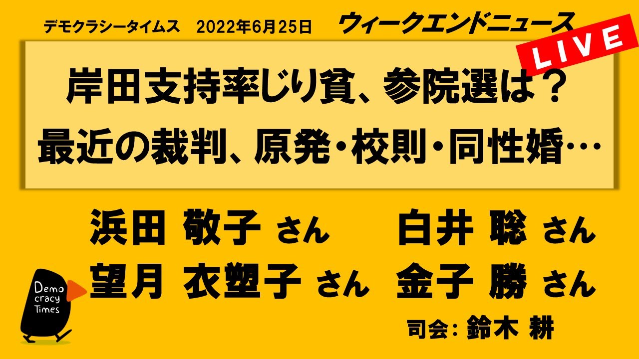 【今週のテーマ】 ・裁判所のおかしな判決 ・参院選始まる ・沖縄、77回目の慰霊の日 【出演】 浜田 敬子さん (ジャーナリスト、元AERA編集長) 白井 聡さん (政治学者、京都精華大学准教授) 望月 衣塑子さん […]