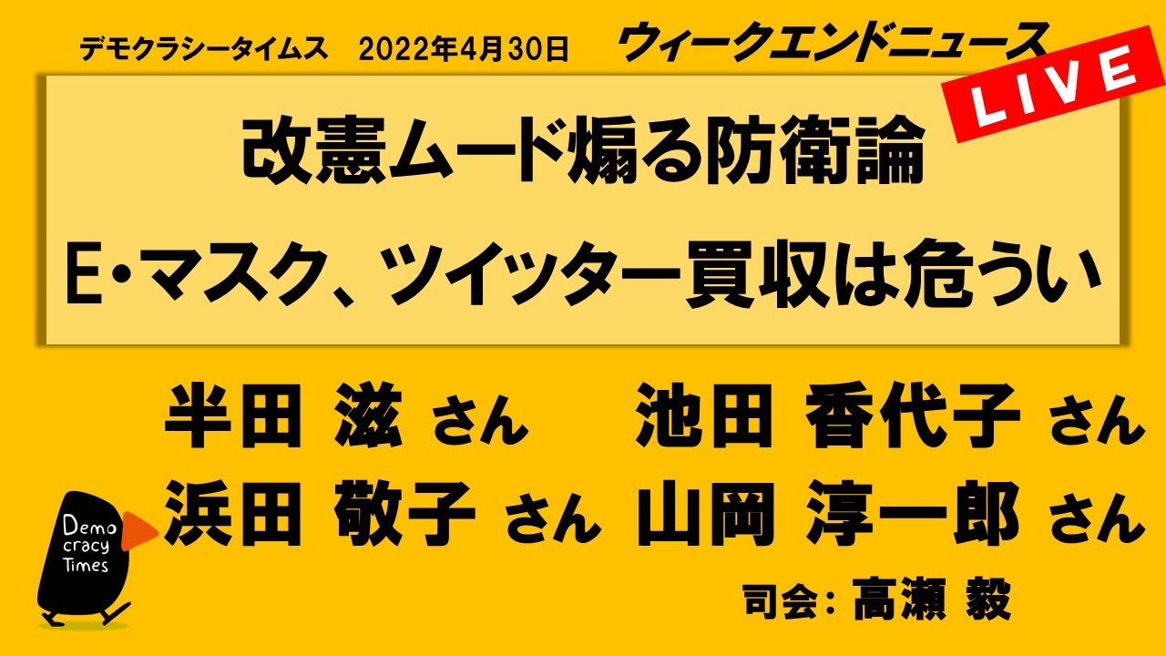 ★今夜19時半~生配信★【WeN】 改憲ムード煽る防衛論 E・マスク、ツイッター買収は危うい ・自民、「専守防衛」逸脱 ・出口見えない「ウクライナ」 ・マスク、ツイッター買収の危険度