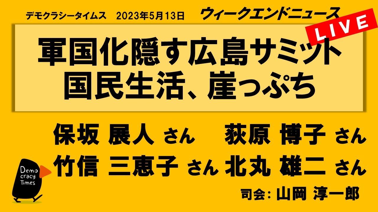 【今週のテーマ】 ・岸田の「外交仮面」をはぐ ・国民生活は崖っぷち ・コロナ「インフル並み」でどうなる 【出演】 保坂 展人さん (世田谷区区長) 荻原 博子さん (経済ジャーナリスト) 竹信 三恵子さん (ジャーナリスト、和光大学名誉教授) 北丸 雄二さん (ジャーナリスト) 司会は 山岡 淳一郎 2023年5月13日ライブ配信