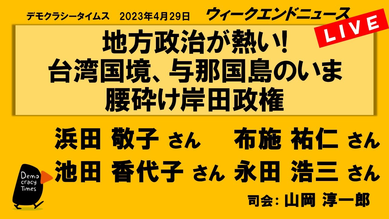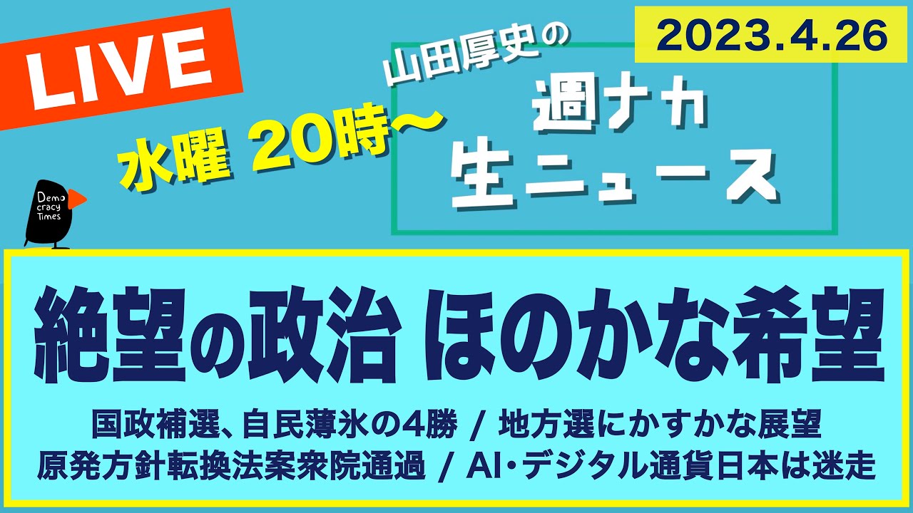 毎週水曜 20時〜 山田厚史の週ナカ生ニュース <気になるニュース> ・国政5補選、接戦制して自民4勝1敗、立民全敗 ・統一地方選 女性が進出、維新の躍進、公明共産の敗北 ・「移民」政策転換、外国人労働者「永住」拡大、子に在特許可? ・何を破壊? 北偵察衛星に措置準備命令 PAC3先島諸島展開 ・22年度物価3%上昇 41年ぶり 植田日銀総裁は「無視」 ・福島1号機、原子炉底抜け確認 関電高浜40年超許可申請 ・脱炭素装い、原発復帰 GX法案、衆院委員会通過 ・「デジタル円」議論始動 財務省が有識者会合 ・省庁横断のAI戦略チーム初会合 G7は「共通基準つくり」 ・クレディスイス預かり資産5%減、 米16地銀預金5%減 2023年4月26日生配信