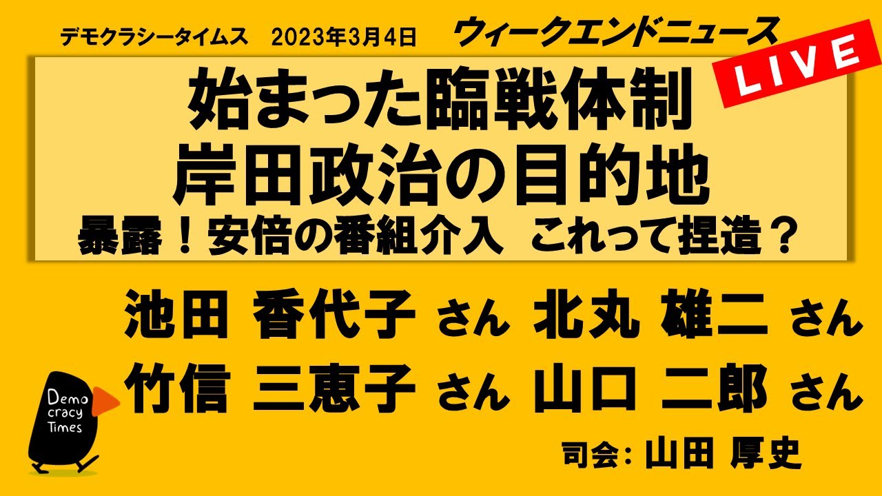 毎週水曜 20時〜 山田厚史の週ナカ生ニュース <気になるニュース> ・放送の「政治的公平」解釈変更文書「本物」、総務省認める ・3.11から11年、復興事業あっても暮らしの復興なし ・石垣島陸自基地にミサイル配備準備は着々 沖縄は要塞化 ・日韓懸案、一挙に政治決着?徴用工問題、韓国「解決策」 ・「強制帰国」させやすい入管法改正案を閣議決定 ・日本の男女経済格差 世界104位 雇用、賃金、セクハラ ・1月の実質賃金4.1%減、物価高が賃金を直撃 ・ 期待の国産H3ロケット打ち上げ失敗 ・ 中国で全人代始まる 米規制業種の経営者ら多数 ・関西生コン和歌山事件、大阪高裁で逆転無罪
