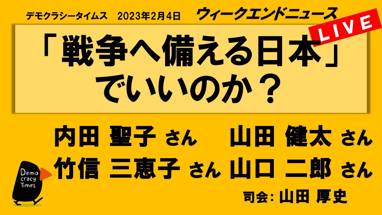 【今週のテーマ】 ・まかり通る「軍拡の論理」 ・これから始まる地方選挙 ・「春闘」が格差を広げる 【出演】 内田 聖子さん (アジア太平洋資料センター共同代表) 山田 健太さん (専修大学教授) 竹信 三恵子さん (ジャーナリスト、和光大学名誉教授) 山口 二郎さん (法政大学教授) 司会は 山田 厚史 2023年2月4日ライブ配信