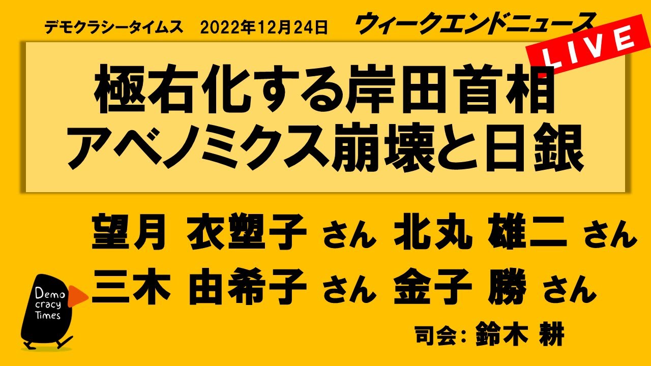毎週水曜 20時〜 山田厚史の週ナカ生ニュース <気になるニュース> ・防衛費突出・教育子育て無視の114兆予算案閣議決定 ・岸田の揺さぶり?「防衛増税の前に解散あり」 ・薗浦辞職、バタバタ秋葉・杉田いまごろ「解任」 ・カルト教団2世への「宗教虐待」で国が指針を発表 ・「独立性の侵食」、学術会議が法改正に反対声明 ・「特定秘密」初適用は海自一佐が海将OBに 米軍動向 ? ・原発政策転換、規制庁とエネ庁内通、六ヶ所村はまた「2年延期」 ・検察審「不起訴不当」ウィシュマさん死亡再捜査へ ・五輪汚職元常務保釈、会計検査院「五輪経費1,7兆」 ・11月消費者物価3・7%上昇 40年ぶり ・物価高騰、価格転嫁認めない企業を公表 キヤノンやっとベア復活 ・追徴金アップル140億 ジャニーズ4000万 2022年12月28日 生配信
