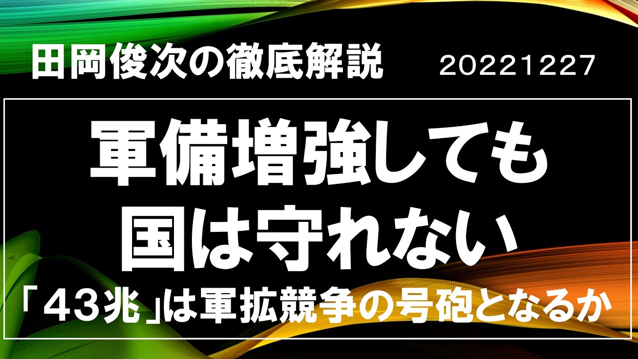 軍事ジャーナリスト田岡俊次の徹底解説。防衛費の増大、軍備の増強をいうまえに、世界では軍備で平和は生み出されたのでしょうか。さらに、アメリカの軍事力によって世界の平和は守られてきたのでしょうか。刷り込みによって、いわば「怖いぞ怖いぞ」と脅されて、借金をし国有地を売り、アメリカに代金を上納する構造に巻き込まれているのではないか。地獄に落ちる、子孫が不幸になると脅されて、借金をしてまで献金、自宅を売って困窮しても売買代金を全部献金というあの構図と同じじゃないか????2022年の最後に、じっくり歴史と国際情勢をうかがいました。 2022年12月27日 収録