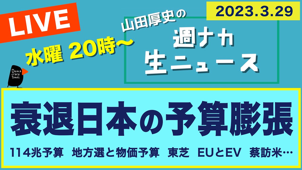 毎週水曜 20時〜 山田厚史の週ナカ生ニュース <気になるニュース> ・史上最大 114兆予算原案通り成立 防衛費6.2%増1.4兆円 ・地方選前に 国会無視して予備費で物価高対策2.2兆円 ・東芝買収受入れ上場廃止へ 不正会計旧経営者に賠償命令 ・ソニー・パナ国策有機EL会社破綻、産業政策の失敗続く ・日銀副総裁「金利2%なら国債含み損50兆円」 ・最高裁 技能実習生死体遺棄事件に無罪 ・「生活保護減額は違法」各地で判決続く、合計7件目 ・岸田、ウクライナに「必勝しゃもじ」戦争は娯楽ではない ・ホンジュラス中国国交、台湾蔡総統訪米 馬前総統訪中 ・EU 合成燃料限定でエンジン車容認 EV化後退なのか? ・ベラルーシにロシア戦略核配備 NATOと軍拡ゲーム 2023年3月29日 生配信