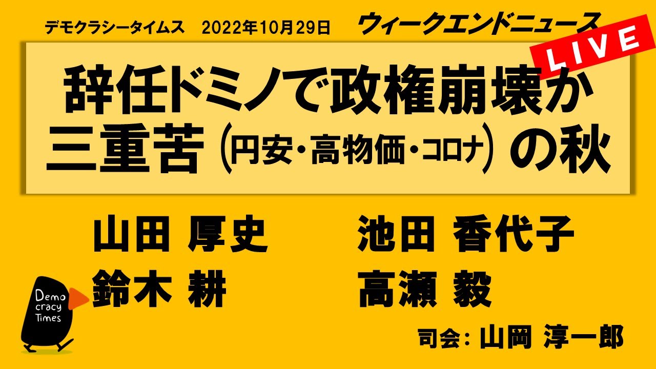 【今週のテーマ】 ・山際経由、麻生、下村、萩生田への道 ?! ・三重苦(円安・高物価・コロナ)のしかかる社会 ・どっちに向かう野党共闘 【出演】 山田 厚史 (ジャーナリスト) 池田 香代子 (ドイツ文学者、翻訳家) 鈴木 耕 (編集者、ライター) 高瀬 毅 (ノンフィクション作家) 司会は 山岡 淳一郎 2022年10月29日ライブ配信