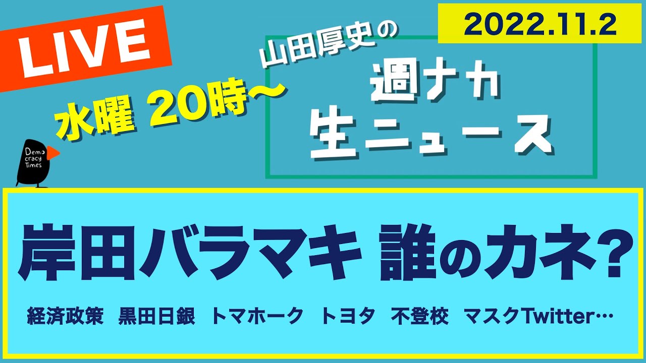 山田厚史の週ナカ生ニュース <気になるニュース> ・経済対策39兆円 補正予算29兆円 使い切れないのにまた国債 ・日銀見込違い 物価上昇修正2.9%、成長下方修正 ・武器購入は青天井?トマホークや対ミサイル衛星、財源は公明も国債 ・取れるとこから実質増税 介護保険料も「高所得者」値上げ ・小中不登校急増24万人 教員不足でブラック職場 ・ゼロゼロ融資 予想通り3割返済不能 困窮79万世帯 ・いよいよスタグレーション? 米もEU利上げ0.75%インフレ10% ・宗教右派が抵抗しても民意は動く 都も「パートナーシップ条例」へ ・EUガソリン車販売「2035年に禁止」決定 周回遅れの日本どうする ・トヨタ岸田の急接近 「増収減益」円安効果インフレで吹っ飛ぶ ・ブラジル、ルラ大統領返り咲き 中南米に左派の波 ・マスク、ツイッター買収 トップ解任、大リストラ、トランプ復活? 2022年11月2日 ライブ配信