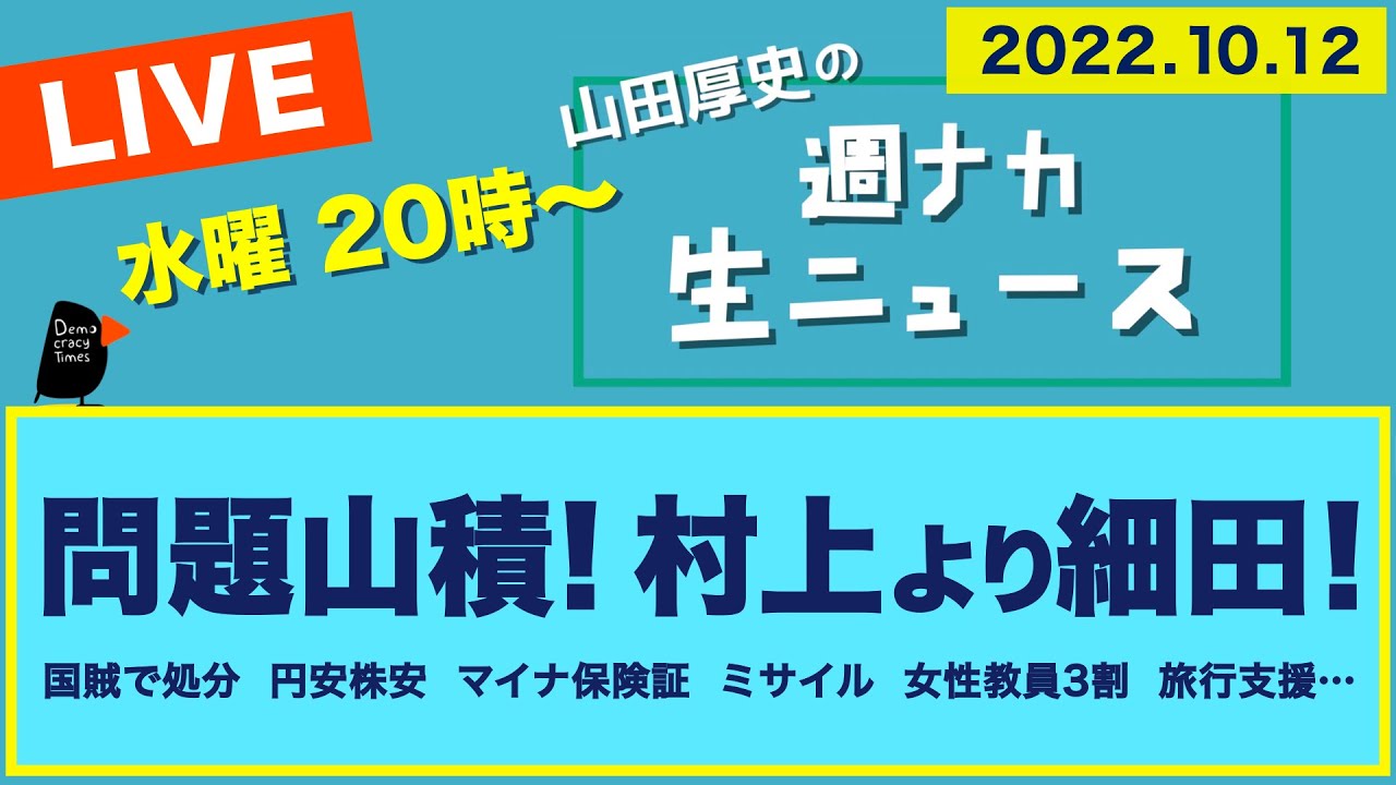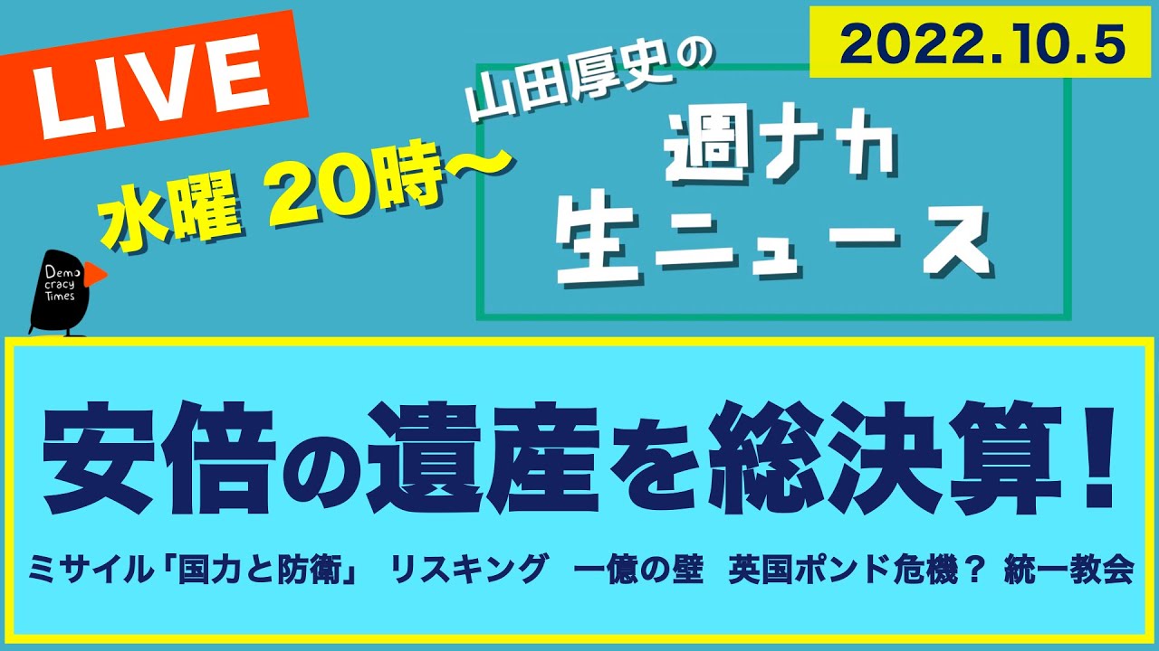 毎週水曜 20時〜 山田厚史の週ナカ生ニュース <気になるニュース> ・「安倍は国賊」発言で、自民党、村上議員を「総務会から追放」 ・説明は紙二枚、権威に泥塗る細田 調査すべきは安倍と政策 ・円安146円、米・日止まらぬ株安 危うし世界経済の離着陸 ・ゴリ押しマイナカード 健康保険証は廃止?自民案 ・入国者上限撤廃 のコロナ第8波はインフルと併発か? ・重要土地規制法 施行 安保上重要58か所から ・北朝鮮 米韓日演習に反応 ミサイル連日発射 核実験再開? ・橋爆破に露ウ全土報復ミサイル 憎悪の連鎖で戦線泥沼化 ・サハリン1も新会社に移管 どうなる国策会社の権益? ・米国 対中半導体規制を強化 製造装置も対象に ・女性教員の比率3割 OECDで最下位 ・バーナンキ議長にノーベル賞 金融バブルは大丈夫? 2022年10月12日生配信