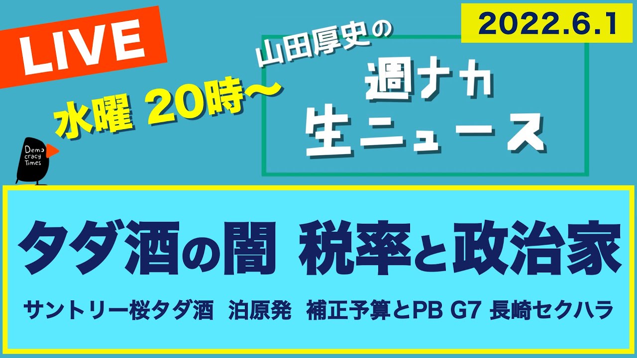 山田厚史の週ナカ生ニュース <気になるニュース> ・岸田の補正予算と骨太方針、PB黒字化「旗は降ろさず」 ・泊原発 再稼働差止め 島根原発 知事同意? 柏崎刈羽は? ・安倍の桜前夜祭疑惑、サントリーのタダ酒提供 ・吉川元農相、有罪判決、政治献金は論外 ・菅派旗揚げ?「勉強会」は参院選後 ・中国 南太平洋と安保? 米はウクライナ一息、対中本腰 ・G7 脱石炭「段階的廃止」、EU ロシア原油年内に9割削減 ・上海封鎖でトヨタ10工場で生産止まる ・長崎市部長のセクハラ・強制性交、市にも責任判決 2022年6月1日 ライブ配信
